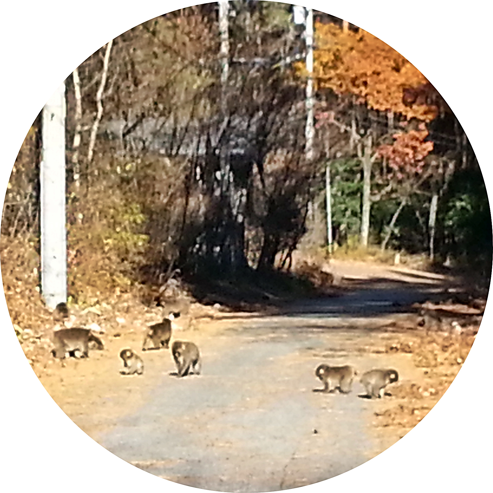 有明の山へ行ったら、道に猿の群れ、しかも、小さい赤んぼの猿がたくさん日向ぼっこしてる。