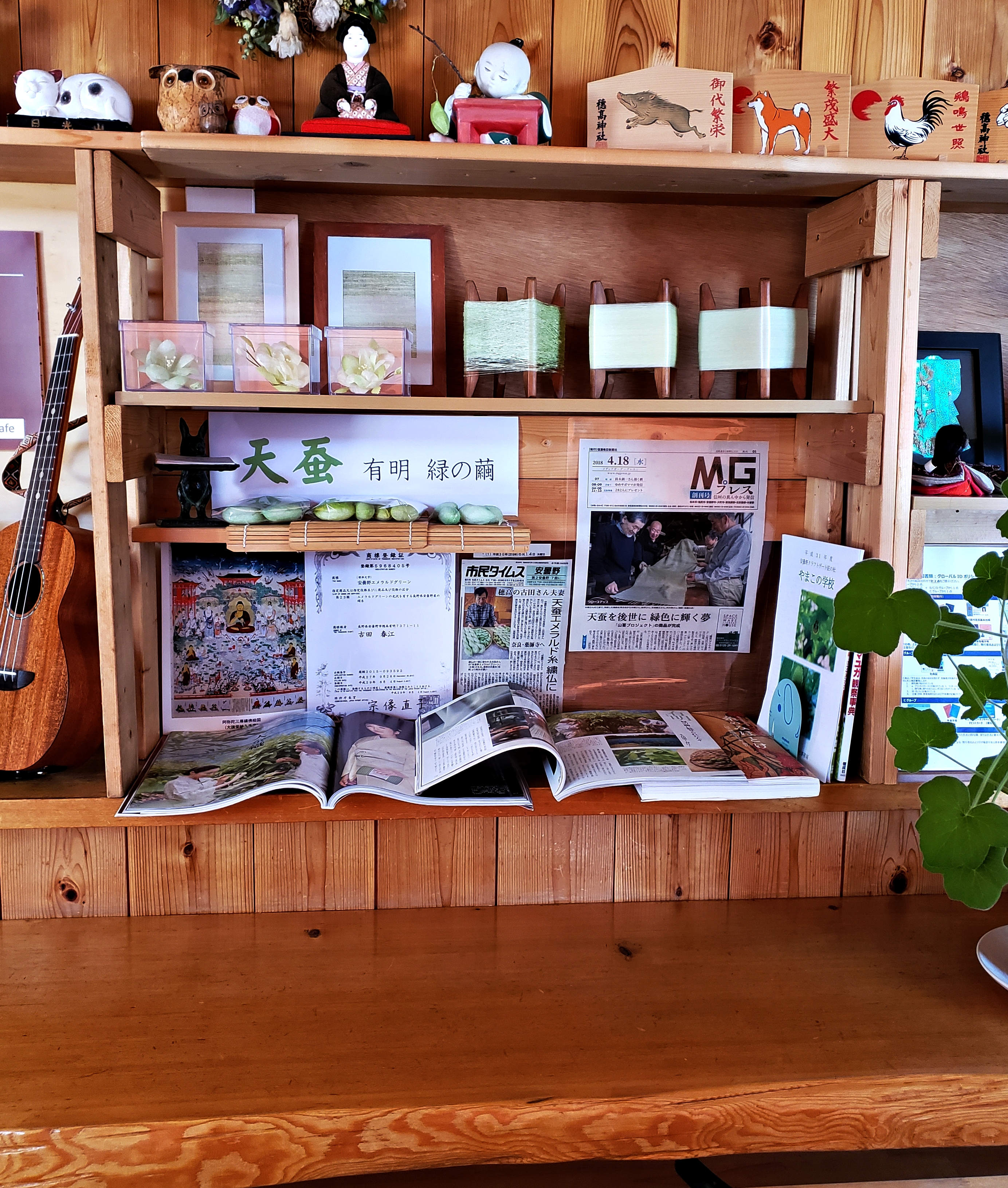 1人でも多くの人に、天蚕のことを知ってほしいという古田さんの情熱に対し、何かできることはないかと考え、穂高駅前の「さとじのHappy Cafe」のカウンターに、天蚕を紹介するコーナーを作りました。