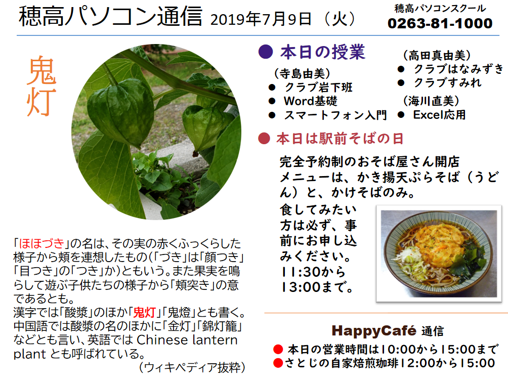 本日(7月9日)は、「そばの日」。今日は、クラブの皆さんを中心に10名の方がご来店。漬物のフルコースをご持参され、豪華な「そばの日」を楽しまれているグループもありました。